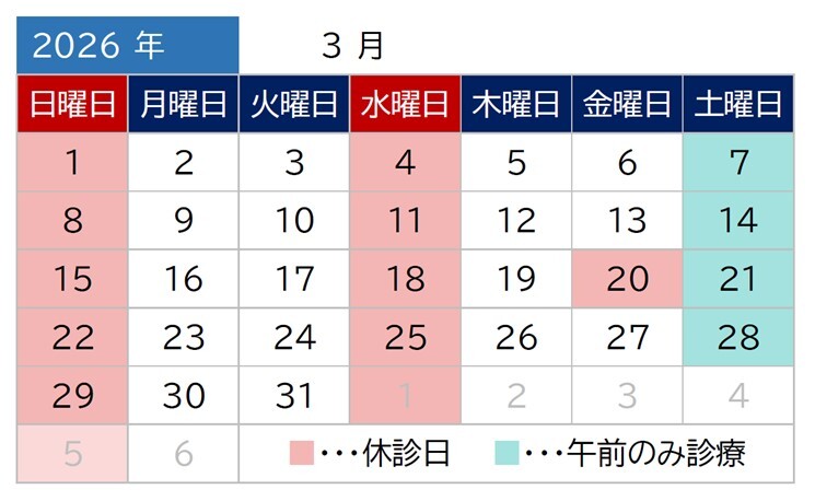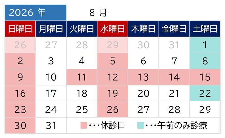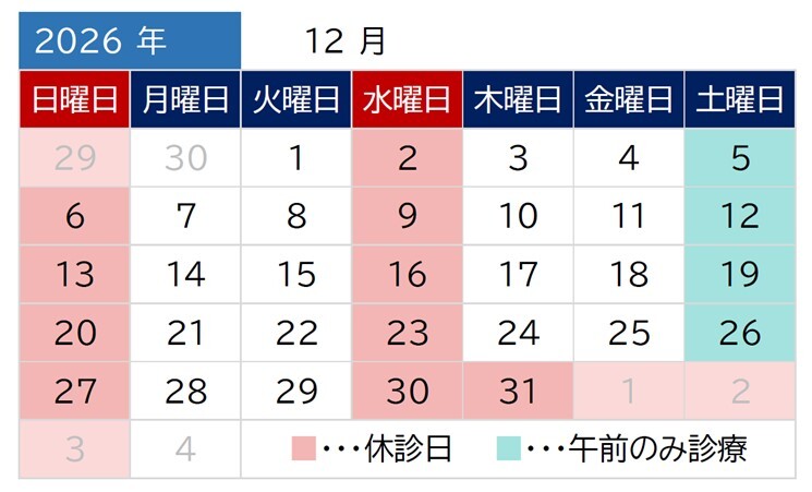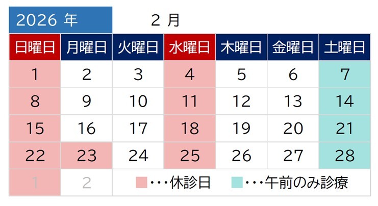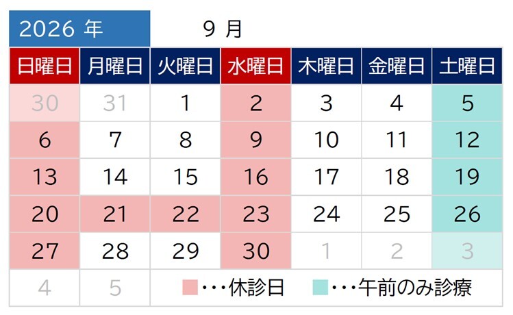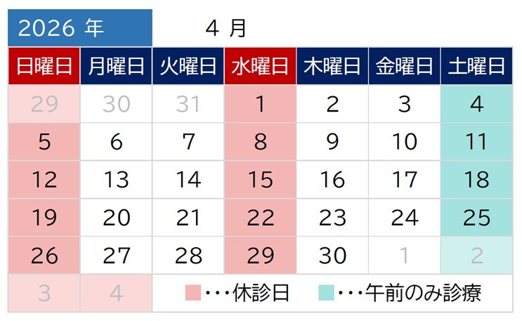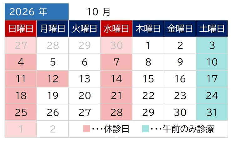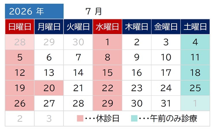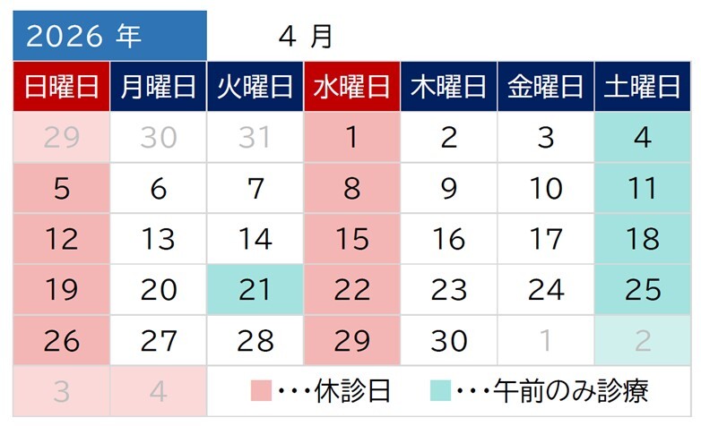 水曜、土曜午後、日曜、祝日、臨時休診あり